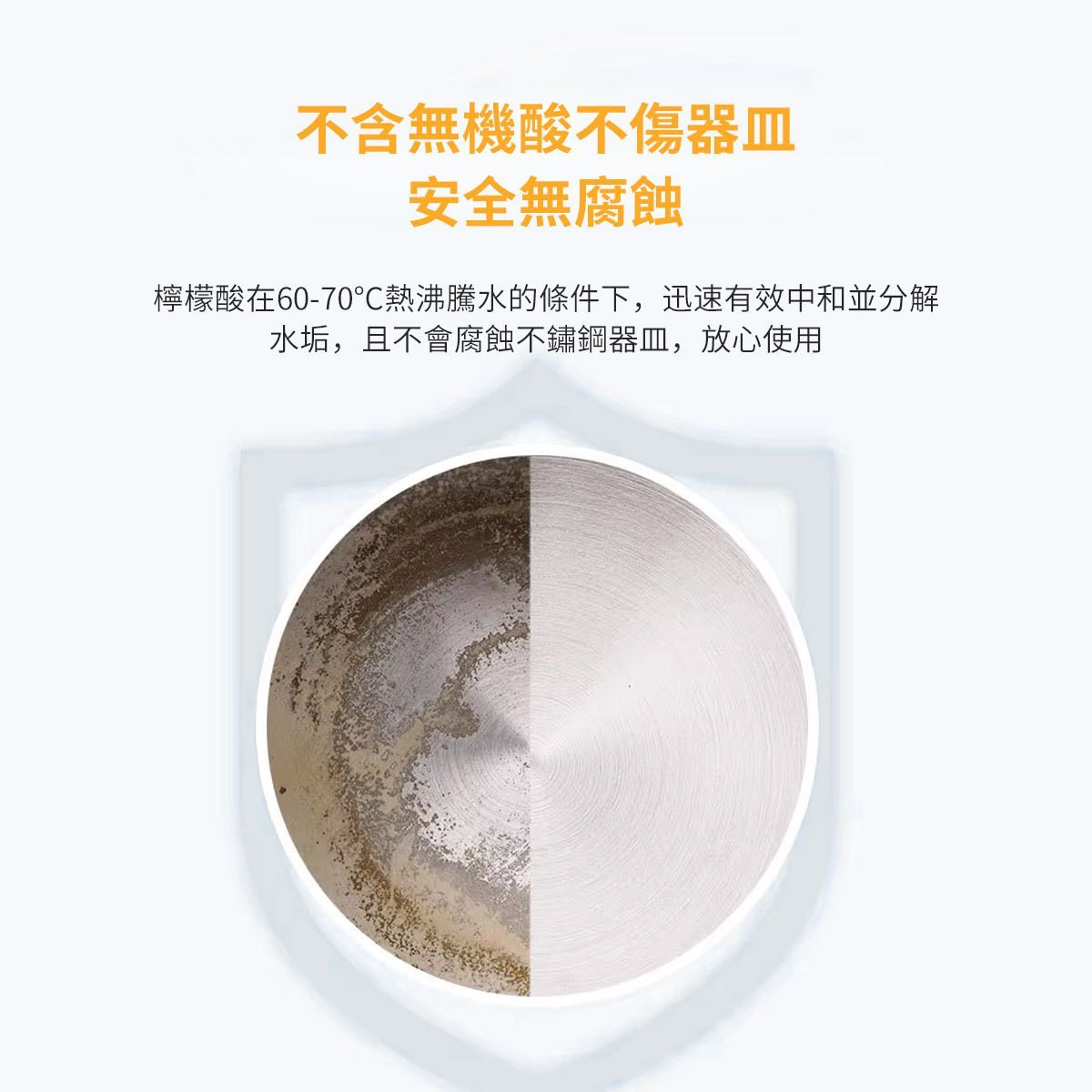  主要成分為檸檬酸,食品級安全配方,可放心使用。